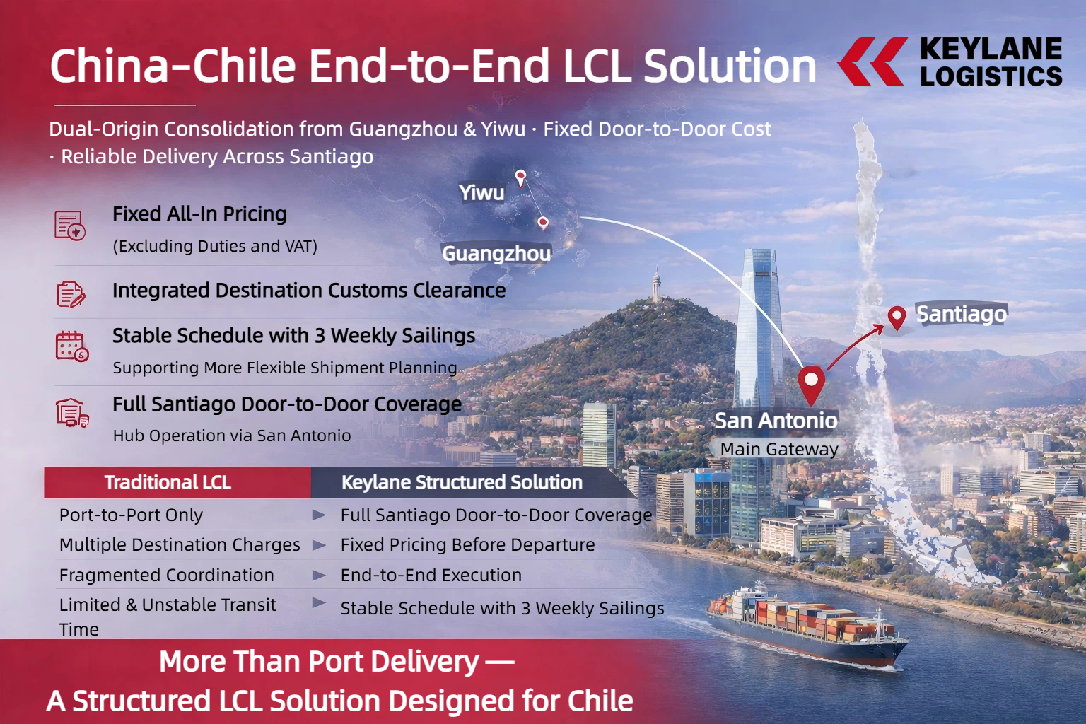 By integrating ocean freight, customs clearance, and land distribution, we offer customers a stable supply chain logistics solution.China-Chile LCL Door-to-Door Logistics Solutions